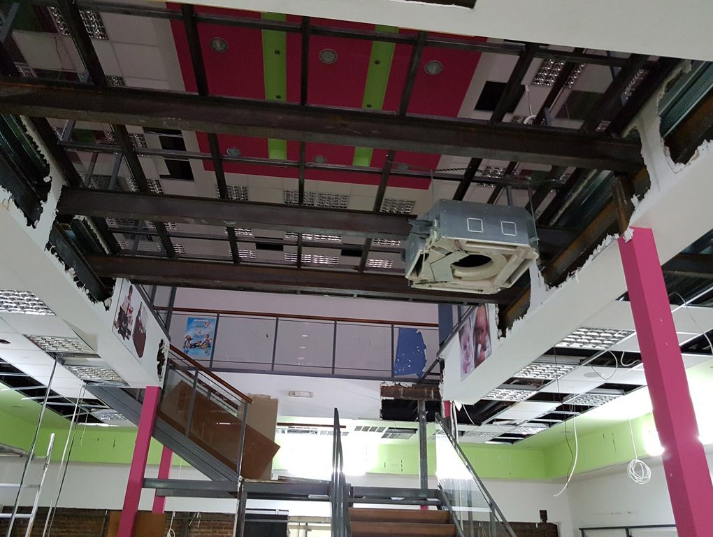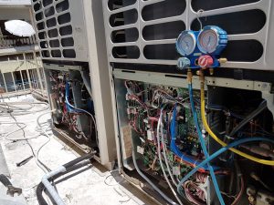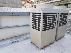 Installation of TOSHIBA vrf system with an array of 2 external units and 4 internal cassette type units.